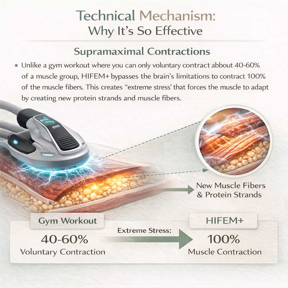 Supramaximal contractions are high intensity muscle pulses that occur at a frequency faster than the brain can signal. While a heavy gym lift might activate 60 percent of a muscle group, HIFEM+ energy forces 100 percent of the muscle fibers to contract simultaneously. This extreme metabolic stress forces the tissue to undergo rapid remodeling by creating new protein strands and increasing muscle fiber density.