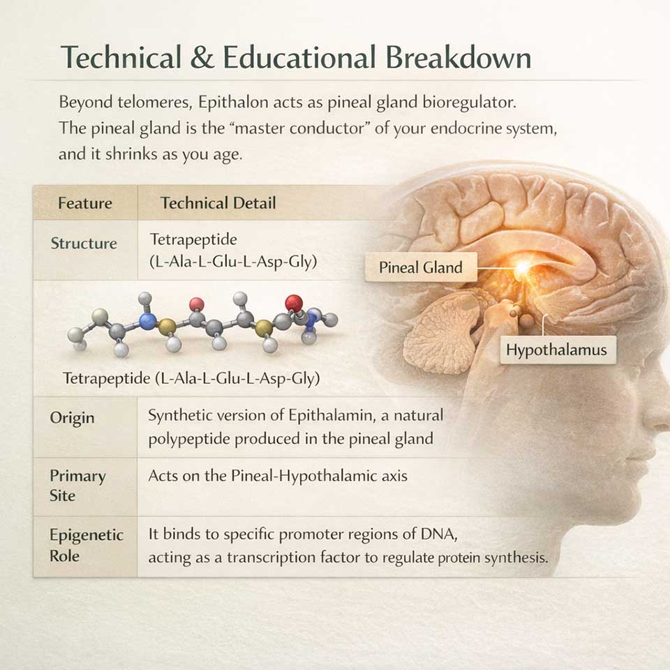 Instead of introducing external hormones, Epithalon acts as a pineal gland bioregulator to normalize the synthesis of serotonin and its subsequent conversion into melatonin. This restores the natural amplitude of your circadian rhythm, which typically flattens as the pineal gland undergoes age-related calcification.