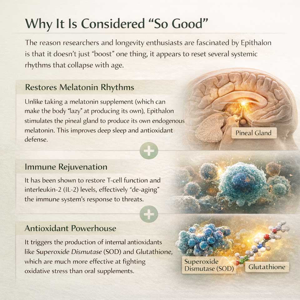 Unlike synthetic hormones or high-dose stimulants, this peptide is a bioregulator that works toward homeostasis. It assists the body in returning to its natural physiological set point, meaning it helps the pineal-hypothalamic axis reach optimal youthful levels without forcing the system into an unbalanced state.