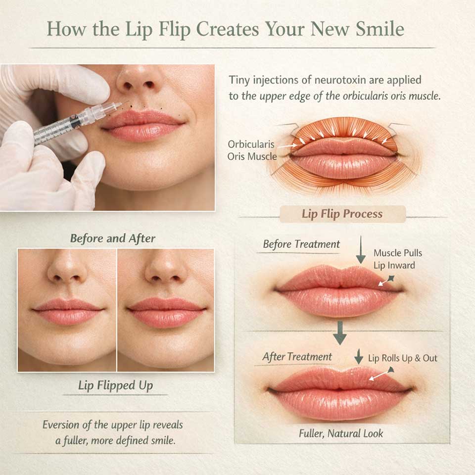 The treatment works by inhibiting the levator labii superioris alaeque nasi muscles, which are responsible for lifting the upper lip too high. By relaxing these specific fibers, the lip rests lower on the gum line while the orbicularis oris relaxation allows the lip to roll out, creating a balanced aesthetic.